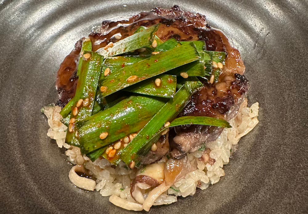 Each dish raised the stakes for the next, and the tteok galbi was the climax. A supple patty of short rib, nestled under a scatter of chivey buchu, over a pillow of Golden Queen rice and earthy oyster mushrooms. I’m so sorry they won’t be serving this if you go. Remembering these flavors—long umami—feels like chasing the back of a slow-moving train, where it seems I’m close to catching it but know I never will.