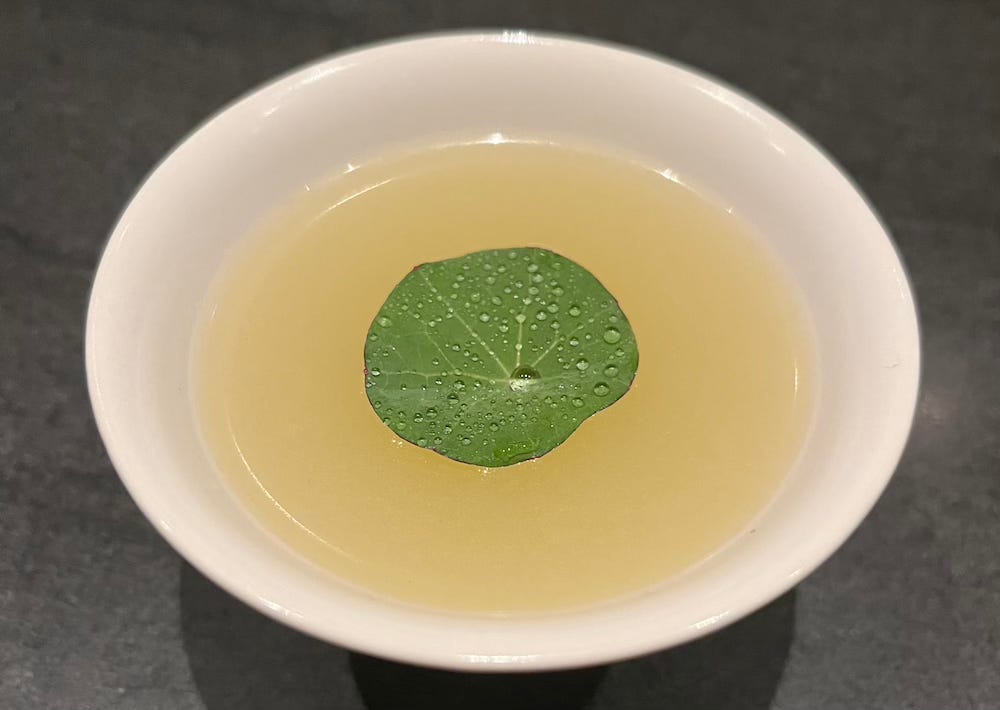 Since the meal is prepared at the bar, there’s very little cooking going on. Outside of a couple induction burners, there is not much in the way of equipment. But containers emerge nonstop, the byproduct of hours and hours of unseen work, revealing component after component. There is a nonstop flow of plating within arm’s reach, quiet progress at every moment.