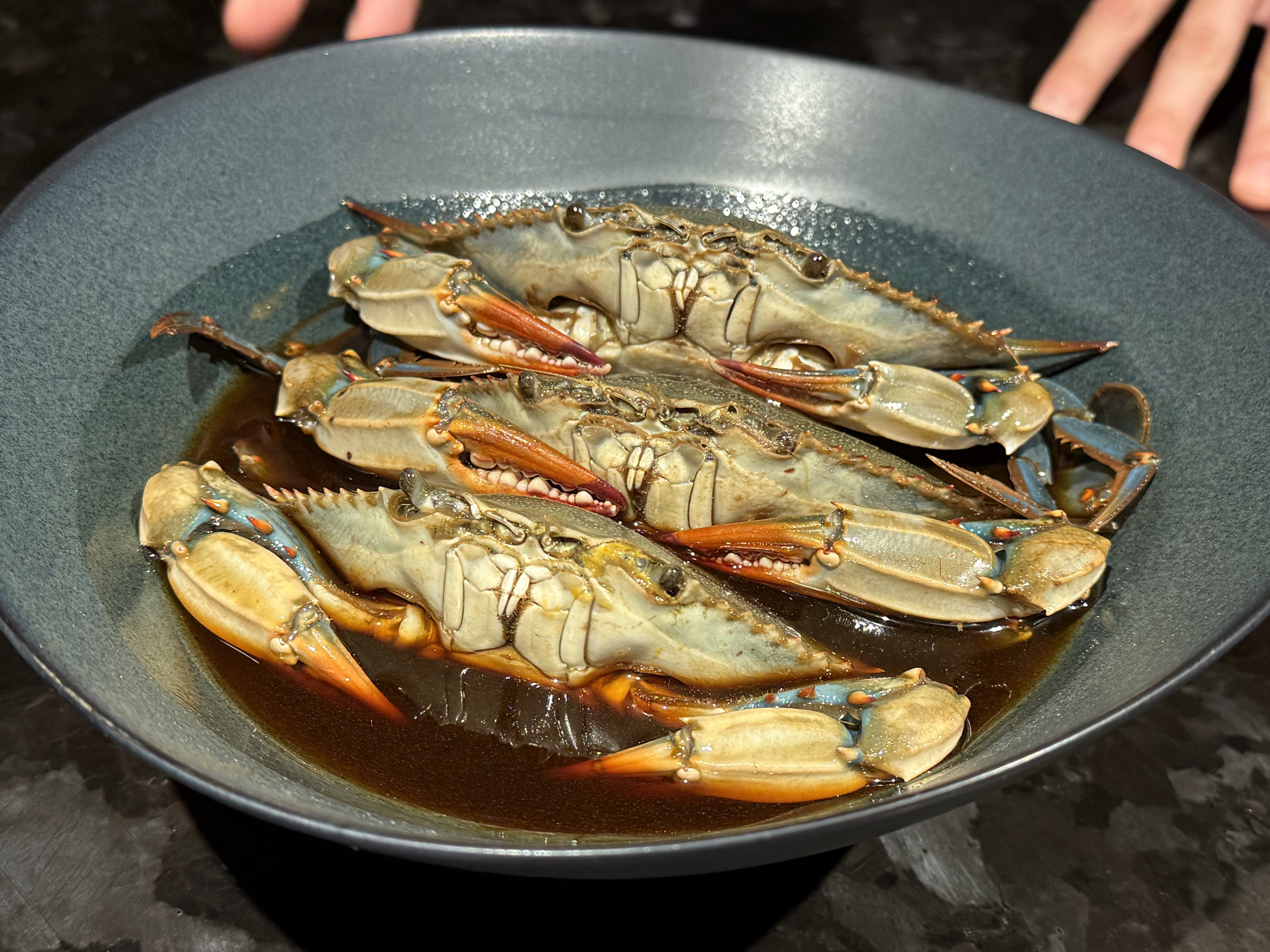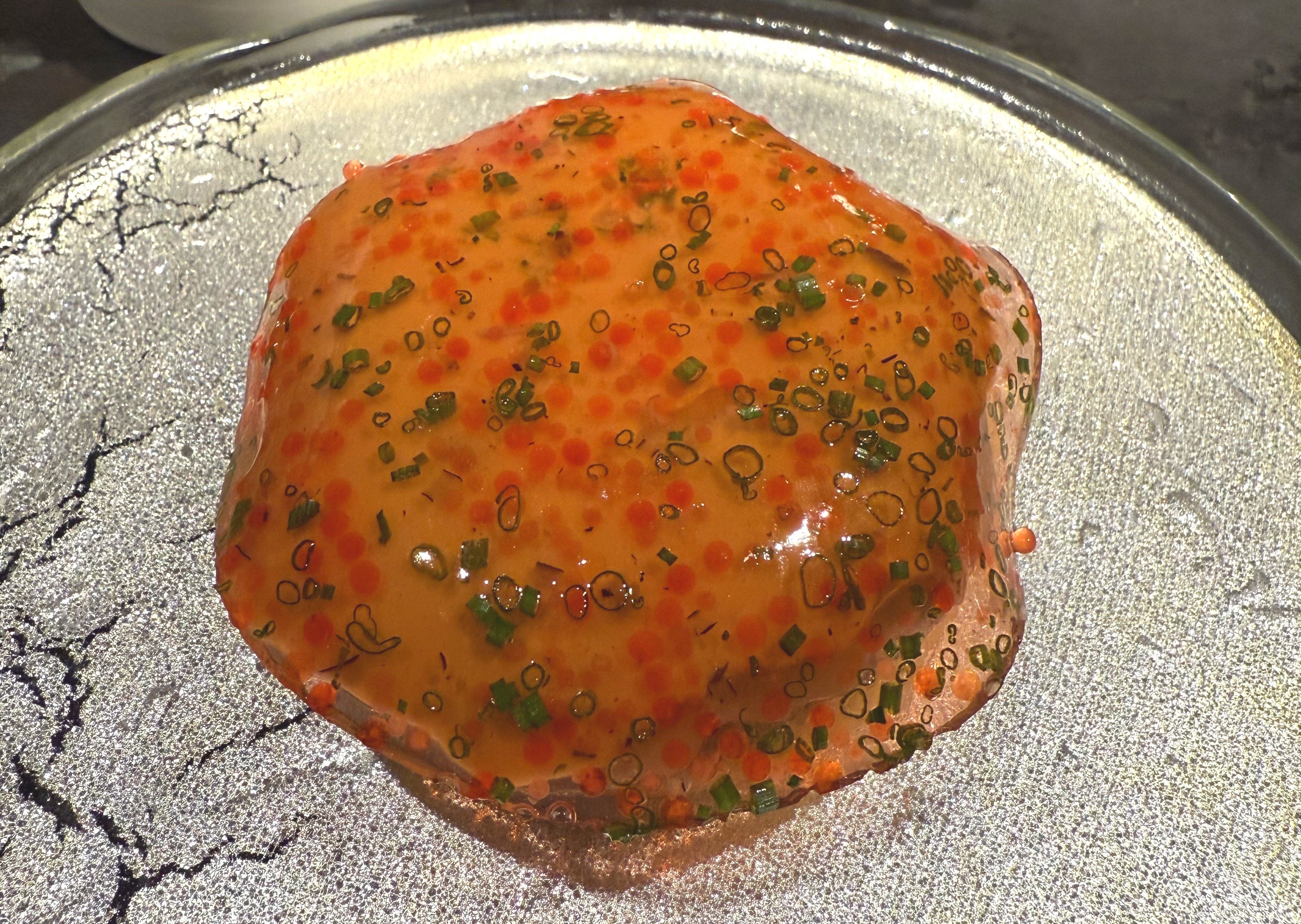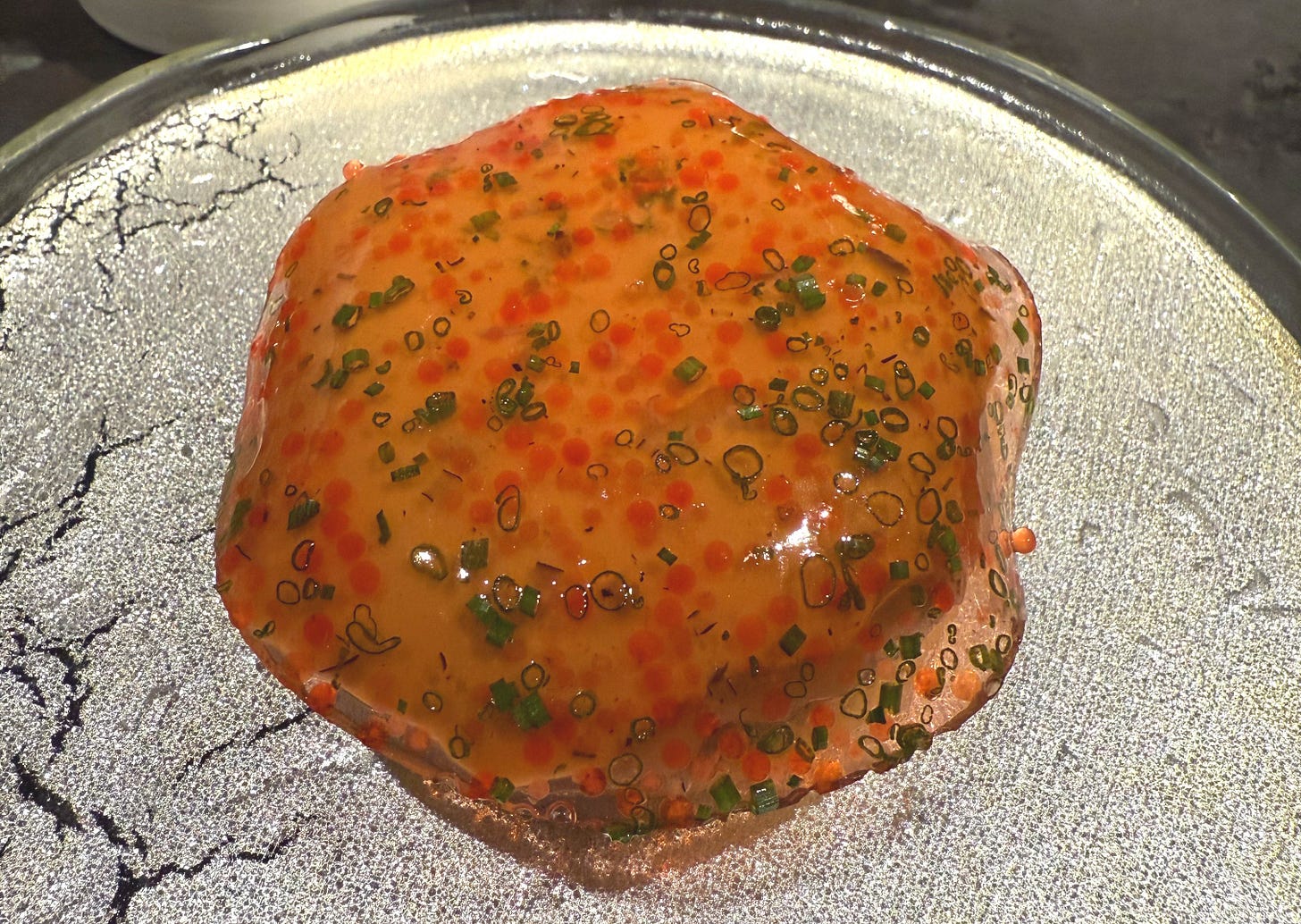 I have never had ganjang gejang, soy sauce-marinated raw crab, but Chef Park’s interpretation of it—the crab meat mixed with unctuous gim rice and Flying fish roe—was the most beautiful dish I’ve ever seen, an accolade I do not bestow lightly. What does it mean when you know that you’ll remember a plate of food for the rest of your life?