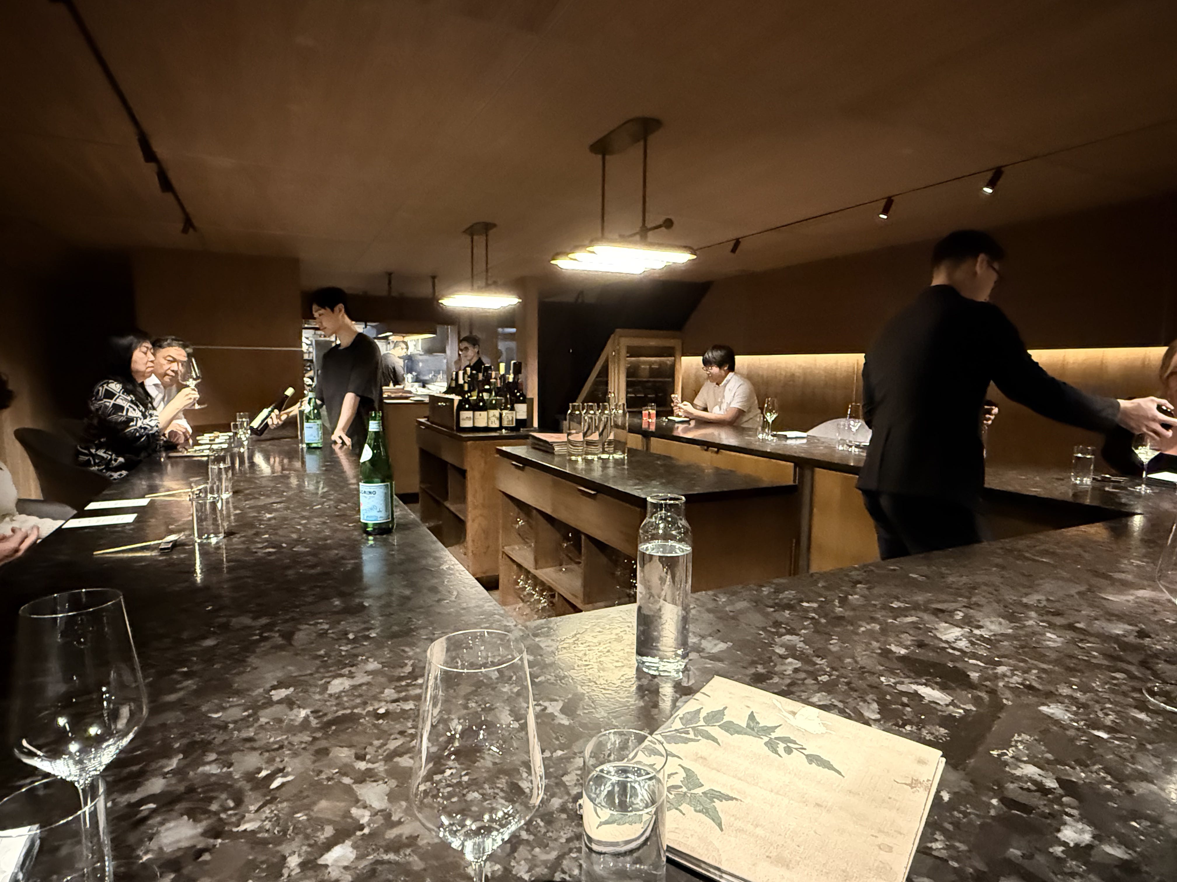 The chef’s counter is not the same form of intimacy as the bar. Upstairs is a close embrace. Downstairs there’s more distance, the low ceiling adding a simmering intensity. The lighting is a hovering glow.
