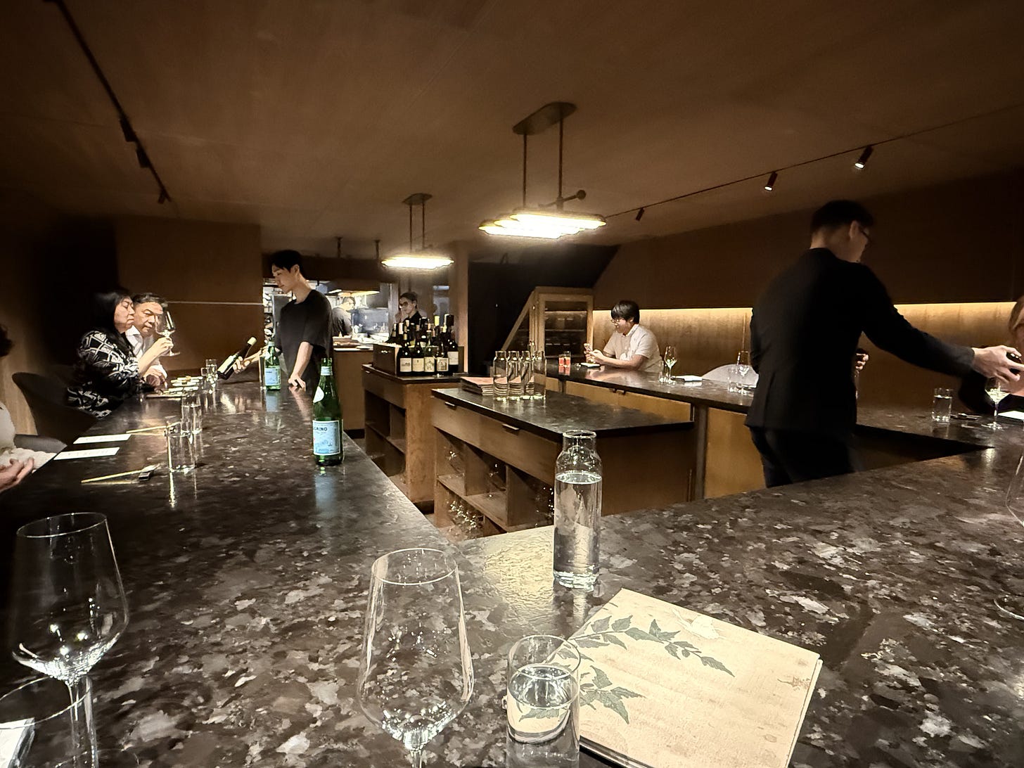A few more steps in and the bar floats in space. Six seats, low, a passing glance of a restaurant. There are stairs that lie beyond it, falling off the platform and descending into who knows what, but you won’t use them. You’ve made it inside, but what’s down there? The silent buzz in the air seems to be coming from some ongoing ceremony below. For now, though, you are here. A completely different menu than the chef’s table. But if handed a dish and asked to determine which it came from, I can’t imagine how someone would know.
