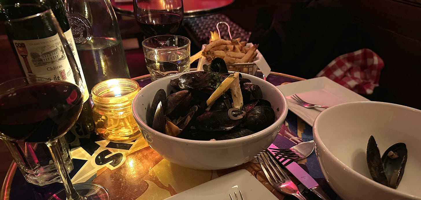 When I lived in Chicago, my spot was Bistro Margot on Wells Street—RIP—with its cozy sprawl of tables and crunchy, butter-soaked green beans. The first place I ever met my wife’s parents. In Los Angeles it was Le Petit Bistro on La Cienega—RIP—where I’d spend birthdays with sole a la Provençale and apple tart à la mode, lucky if the accordion player was there in the back that night, or a jazz trio with a singer.